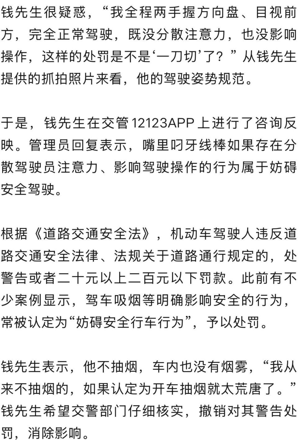 随后,记者又拨通了江苏省交通事故报警热线电话进行咨询。工作人员表示,在正常驾驶的情况下,叼牙线棒不算违法。“手没离开方向盘,正常开车的话,我觉得不算违法。”